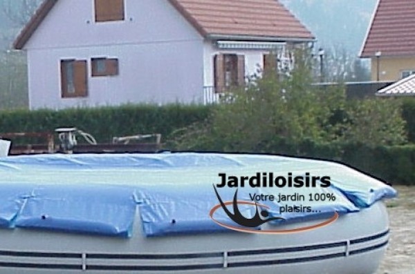 Bache d'hiver Zodiac pour piscine Zodiac Ovline 4000, hors-sol ou semi-enterrée, en toile enduite PVC coloris bleu avec boudins périphériques à remplir d'eau.