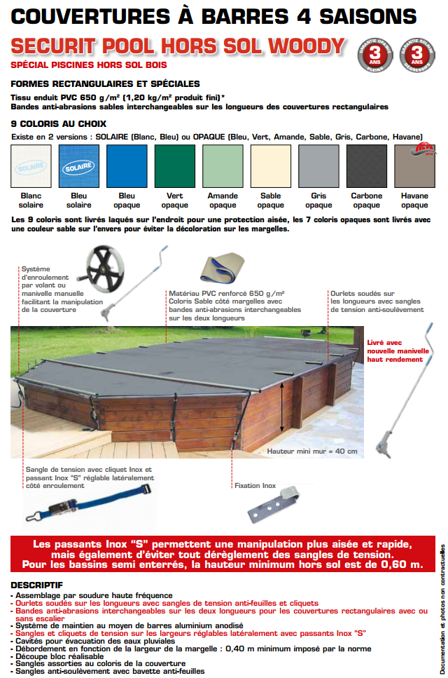 Securit Pool Hors Sol Woody est une couverture piscine à barre haut de gamme à prix discount : Sa conception empêche toute feuille ou aiguille de pin de pénétrer dans votre piscine et la qualité des matériaux utilisés en font une couverture de piscine insensible aux intempéries (pluie, neige, vent) et pérenne. Cependant, en cas de neige abondante ou vent violent la couverture doit être enroulée.Couvrir ou découvrir votre piscine ne vous prendra pas plus de 2 à 3 minutes selon la taille de votre piscine.