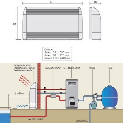 Le deshumidificateur Zodiac Sirocco Ambiance 110 pour piscine de 30 à 40m² est équipé, en plus d’un circuit thermodynamique (pompe à chaleur air / air), d'une batterie eau chaude de 12KW permettant de transformer un air chaud et humide en air plus chaud et sec. Son fonctionnement en tout air recyclé permet une exploitation économique et très nettement inférieure à une solution “tout air neuf”.