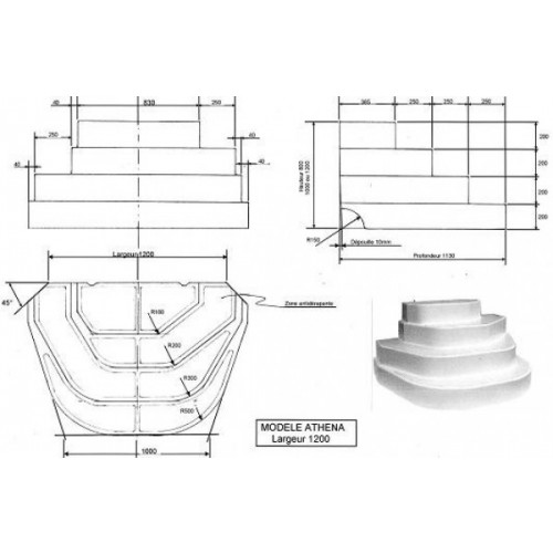 Escalier Athena 1.2m hauteur 80cm, 4 marches, conçu en résine Polyester et fibre de verre. Sans cannes vendues en option, l'escalier est à fixer à l'aide de colle et de bandes velcros sur la paroi verticale de la piscine et escalier. Coloris au choix.