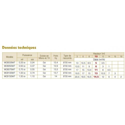 Débit d'eau moyen (m3/h) | 6 | 8 | 10 | 13 | 14 |