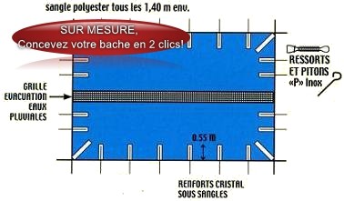 - Son assemblage d'une pièce, soudée, en tissu polyester ultra résistant enduit PVC de 580gr, traité anti UV, antifongique et recouvert d'un verni anti salissures afin de faciliter son entretien. coloris sable en sous face, prolongeant la vie de la couverture et évitant toute trace ou décoloration des margelles.